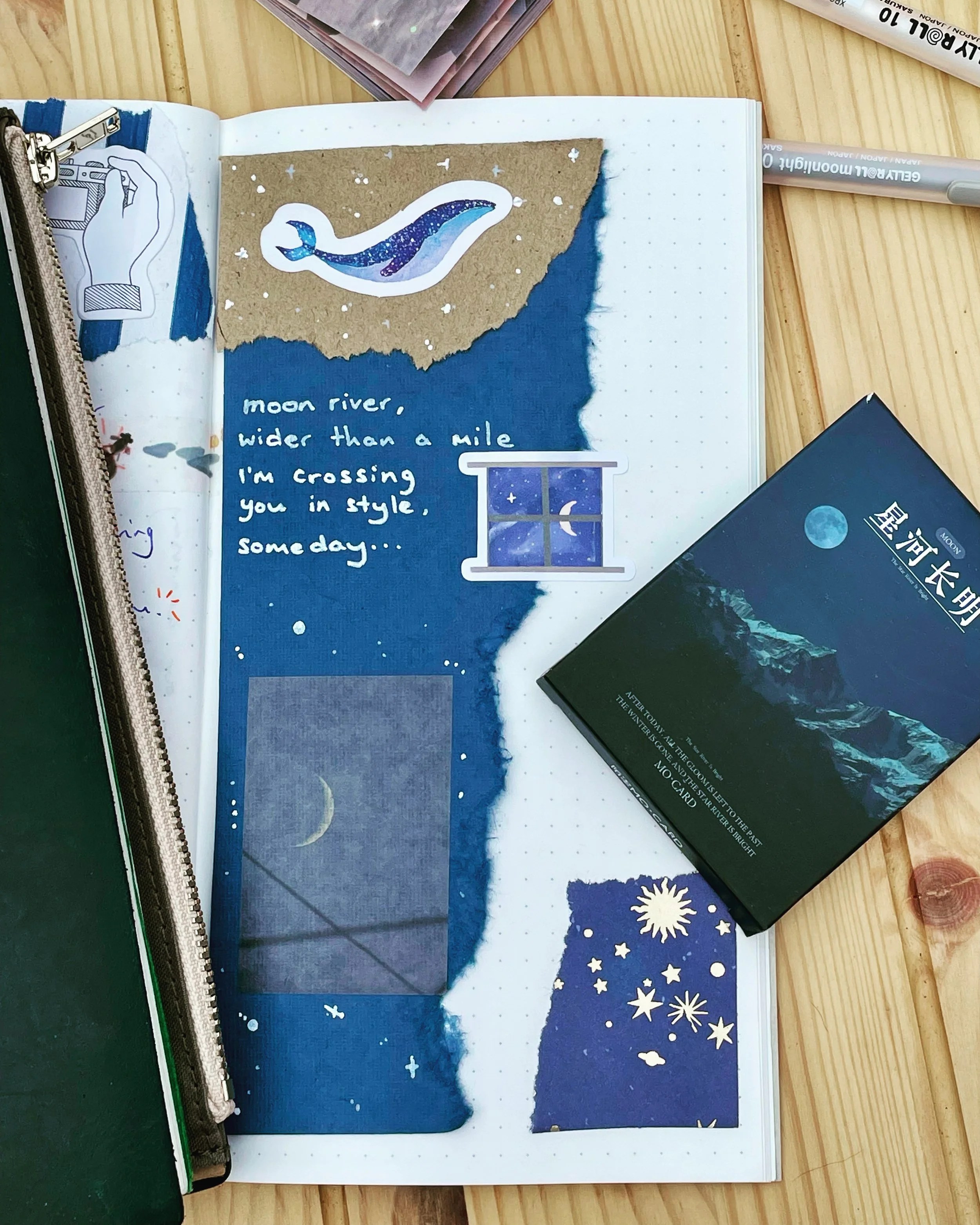 I think I need the time and perspective to process my emotions, thoughts or feeling of the moment and journal about them later, that could be later that day or even that week. I will decorate my pages with ephemera, like tickets or labels – mementos of a day well spent. Collaging these fragments with stickers, washi tape, stamps and scraps, they create a canvas for me to write on, write around, write through. I let my feelings be reflected in the colours I choose if I don’t have the words or courage to write. If I don’t have my own words to describe my day; I’ll use someone else’s be it a song, quote or poem.